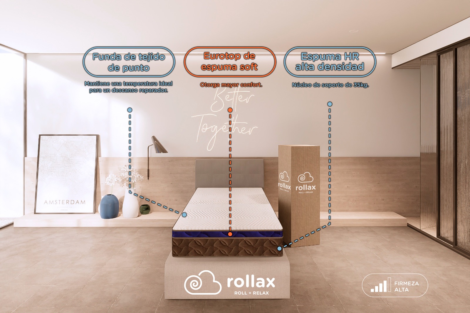 Un descanso reparador es la clave para disfrutar de un amanecer placentero. Colchón Rollax (roll + relax) brinda noches repletas de dulces sueños. Creado con materiales de calidad, asegura una experiencia saludable y duradera.